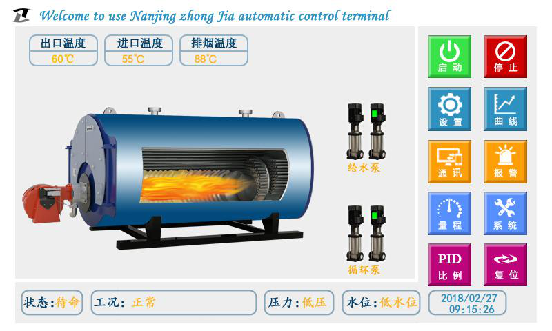 在屏幕正下方顯示控制器的工況。工況包括定時(shí)信息和燃燒器狀態(tài)。非報(bào)警狀態(tài)下,無(wú)定時(shí)顯示 “無(wú)定時(shí)”,有定時(shí)顯示“啟動(dòng)時(shí)段”或“停止時(shí)段”;報(bào)警狀態(tài)下顯示具體的報(bào)警信息。屏幕上同時(shí)顯示燃燒器(加熱組)、補(bǔ)水泵(給水泵)、循環(huán)泵(冷凝泵)的工作狀態(tài),水泵的 主備狀態(tài)和手自動(dòng)狀態(tài)。