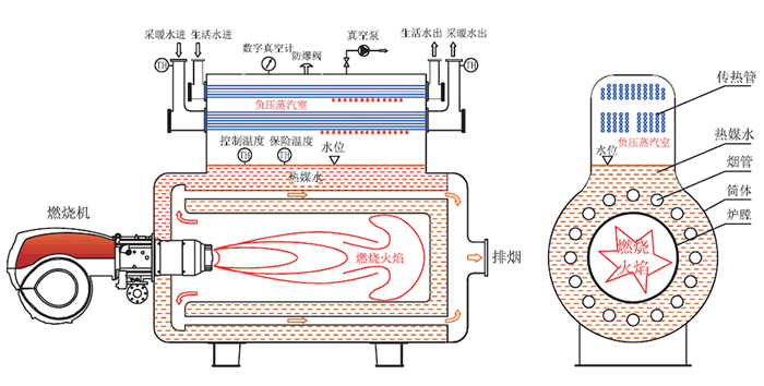 真空鍋爐是在封閉的爐體內(nèi)部形成一個負(fù)壓的真空環(huán)境,在機(jī)體內(nèi)填充熱媒水。通過燃燒或其它方式加熱熱媒水,再由熱媒水蒸發(fā)—冷凝至換熱器上,再由換熱器來加熱需要加熱的水。